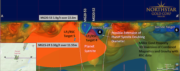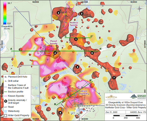 “GoldSpot’s state-of-the-art machine learning analysis and 3D inversions clearly suggests that the alkalic syenite intrusive gold system at the Miller Gold Property is much larger than previously indicated. GoldSpot has identified no less than eight new syenite gold exploration targets along 2 property-wide trends, providing numerous drill targets that can potentially result in a number of new gold discoveries on the Property” states Brian P. Fowler, CEO of Northstar. “With the recent close of a $2.4M private placement tranche (See Northstar News Release dated December 23, 2020), Northstar is fully funded to expand the new Allied Gold Zone discovery and test these new targets with a Phase II diamond drill program in early 2021.”