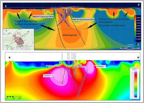 Figure 3A. Allied Syenite Section Illustrating 3D Inversion of Metal Factor and Potential Gold-Bearing Sulphide Mineralization