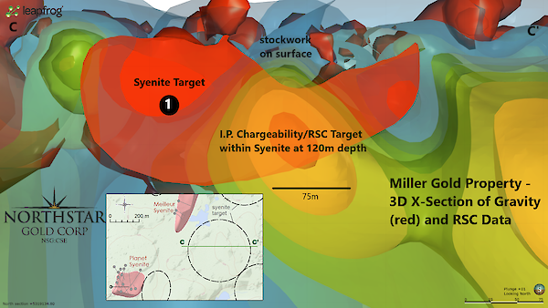 Vancouver, B.C., January 11, 2020. Northstar Gold Corp. (CSE:NSG) (“Northstar” or the “Company”), reports that machine learning stochastic cluster analysis and final 3D inversions by GoldSpot Discoveries Corp. (GoldSpot) on a 2020, 5 km2 gravity and magnetic geophysical survey dataset has identified multiple anomalies with the same signature as known gold-bearing syenites on the Miller Gold Property (Figure 1).